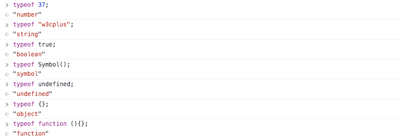 typeof 37; // => "number" typeof "w3cplus"; // => "string" typeof true; // => "boolean" typeof Symbol(); // => "symbol" typeof undefined; // => "undefined" typeof {}; // => "object" typeof function (){};// => "function" Chrome浏览器运行结果如下图所示: