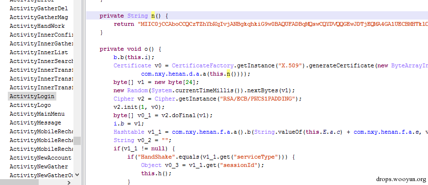 本文的起因源于对一个手机银行APP的分析。该APP使用了HTML进行数据传输,并使用了RSA和DES算法对数据加密。首先在本机利用时间戳随机生成一个用于DES加密的秘钥,然后在与服务器握手时用RSA算法(函数n返回的就是公钥)对DES秘钥加密后发送给服务器。
