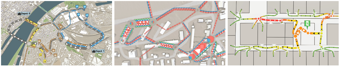 在这篇论文中,作者提出了一种从大量运动数据中自动生成流图的技术。该技术能够在一个可视化视图中同时呈现多种不同的流的属性,如不同的材质、方向、流的起点和终点。此项技术的基础是根据应用的语义和地理空间上下文把空间分割成多个区域。分割后,计算相邻区域之间的流属性数据。生成的流图可以在不同地图层级间变化,而且能够保留重要的细节特征,如图1所示。