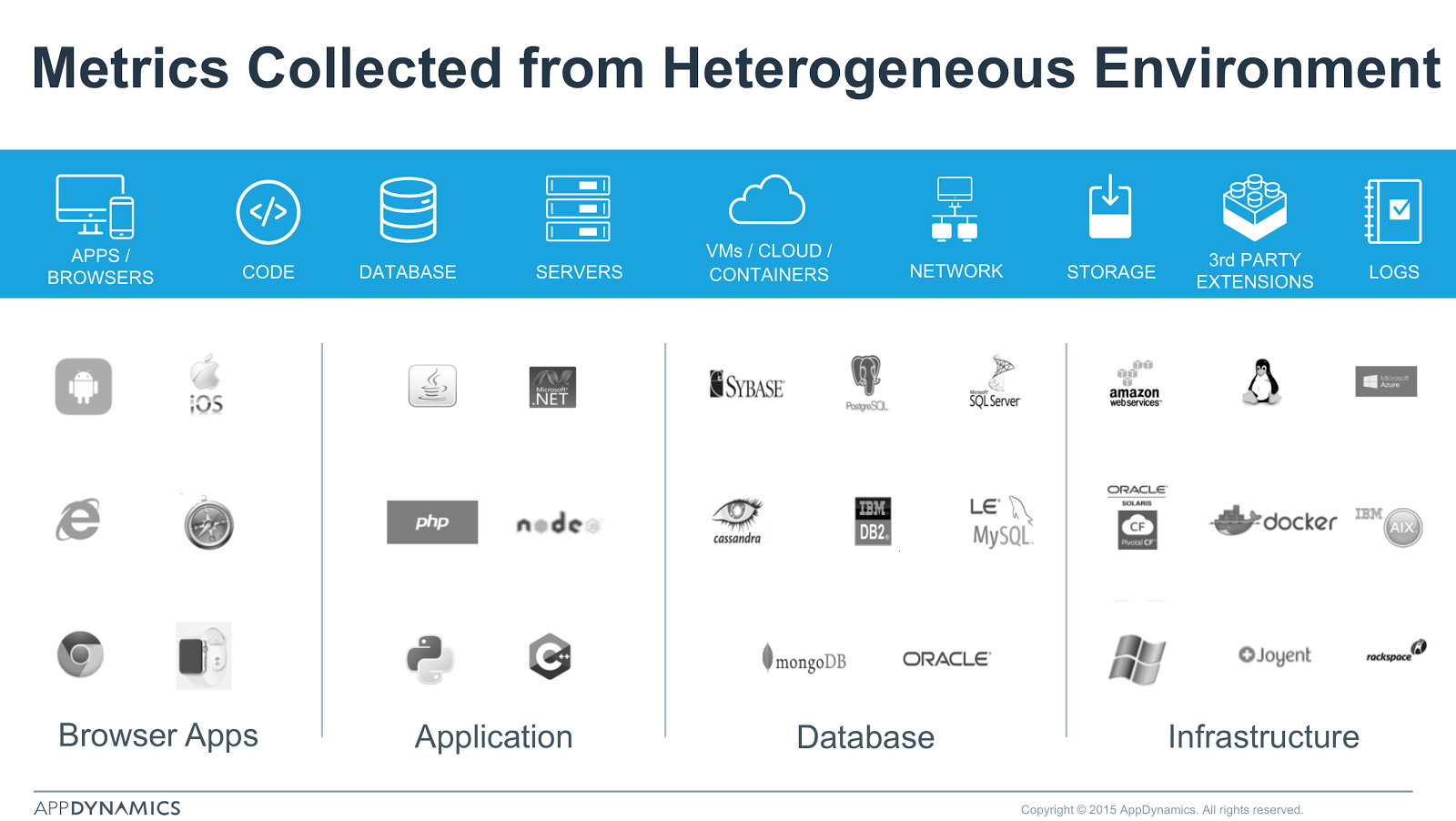 AppDynamics的程序性能管理(Application Performance Management ,APM)代理在为几千个程序几百万行代码收集性能指标,它们支持包括Jave、.Net、Node.js、PHP和Python等在内的多种语言和框架。可收集浏览器、手机和服务器程序数据,还有扩展程序从各种异构程序和基础设施模块收集数据。收集到的指标被周期性的发送给指标处理引擎,它把各种维度的指标收集起来再以不同角度的视图展示出去。