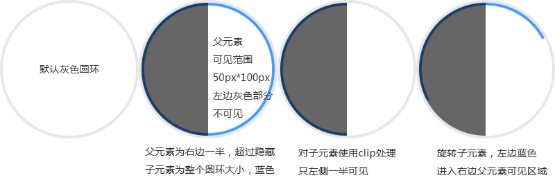 半圆环由两层结构构成, .cicle-right 的大小为50px 100px,超过隐藏,而 .right-inner 的实际大小为100px 100px,因为父容器宽度为50px且超过隐藏所以只会显示右边一半,如果只是这样的话我们旋转 .right-inner 的话右边一直会有蓝色的半环。所以我们对 .right-inner 再做个裁剪处理 clip: rect(0, 50px, 100px, 0); ,这样导致整个 .right-inner 圆环只有左半边可见,然后加上我们父元素是在右半边且多余隐藏,所以默认看不到我们的蓝色圆环,如要看到蓝色圆环部分只有将 .right-inner 左边部分旋转到右边父元素的范围内,核心代码如下图: