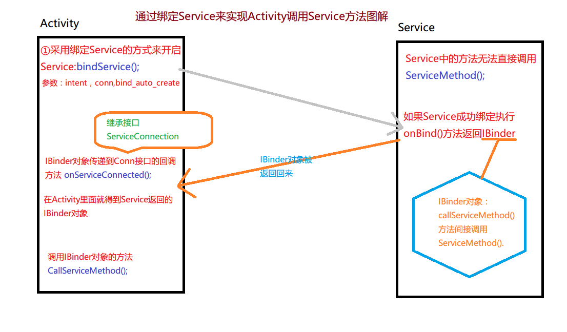 以Activity调用Service中的方法为例,具体流程参考博主绘制的流程图: