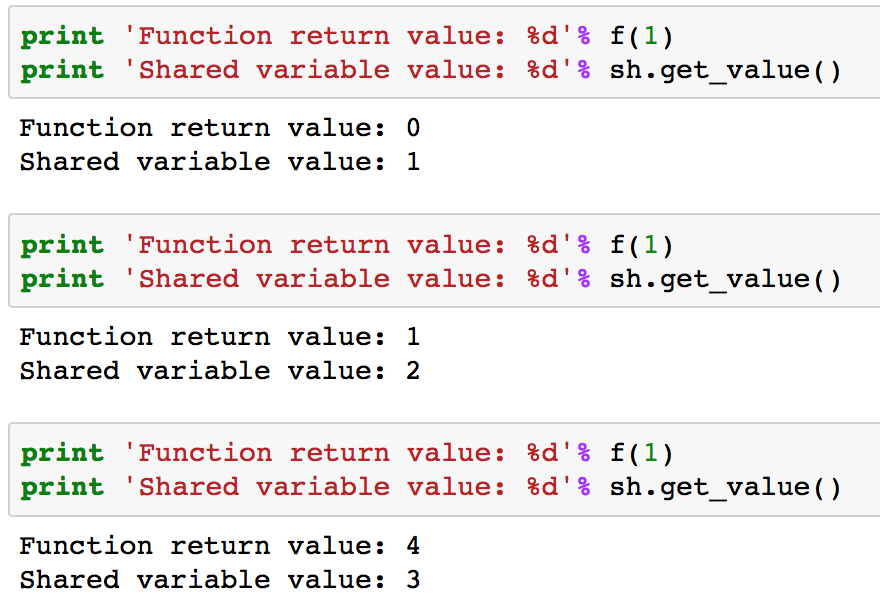 from theano import shared x = T.iscalar('x') sh = shared(0) f = function([x], sh**2, updates=[(sh,sh+x)])