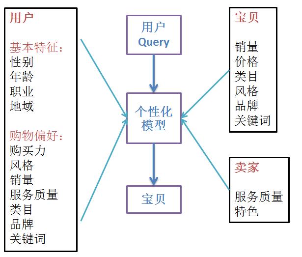 个性化模型根据用户的个性化偏好、物品特征以及卖家特征,做出二次排序模型,然后再展示给用户;搜索结果和营销资源等方面的充分应用,目标是让消费者看到和他最相关的商品展现,最终实现千人千面的淘宝。