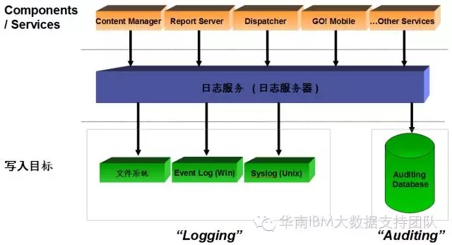 下图是日志服务的架构示意图。审计日志由 Cognos 的 log 服务来记录和管理。Log服务相对其他组件保持独立,因此系统其它组件的错误不会影响日志系统。日志可以写入/同时写入到不同的介质,如文件系统或者数据库。