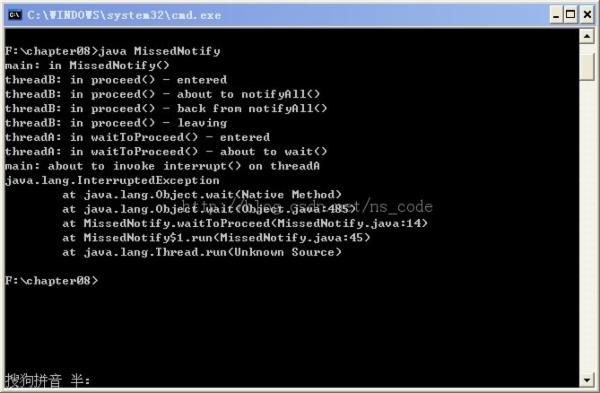 分析:由于threadB在执行mn.proceed()之前只休眠了500ms,而threadA在执行mn.waitToProceed()之前休眠了1000ms,因此,threadB会先苏醒,继而执行mn.proceed(),获取到proceedLock的对象锁,继而执行其中的notifyAll(),当退出proceed()方法中的synchronized代码块时,threadA才有机会获取proceedLock的对象锁,继而执行其中的wait()方法,但此时notifyAll()方法已经执行完毕,threadA便漏掉了threadB的通知,便会阻塞下去。后面主线程休眠10秒后,尝试中断threadA线程,使其抛出InterruptedException。