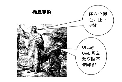 撒旦(Satan),西方神话宗教人物,上帝和人类邪恶的敌人,通常被认为是堕落天使的领袖,不折不扣的恶魔,他有一个最好的把戏,是在不同人的面前可以显现不同的面目——变脸。令撒旦想不明白的是,耶稣怎么会有那么多跟随者呢?