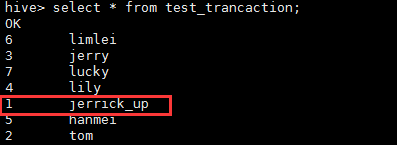 create table test_trancaction (user_id Int,name String) clustered by (user_id) into 3 buckets stored as orc TBLPROPERTIES ('transactional'='true'); create table test_insert_test(id int,name string) row format delimited fields TERMINATED BY ','; ---临时表 hive> select * from test_insert_test; OK 1 jerrick 2 tom 3 jerry 4 lily 5 hanmei 6 limlei 7 lucky insert into test_trancaction select * from test_insert_test; hive> > select * from test_trancaction; OK 1 jerrick 2 tom 3 jerry 4 lily 5 hanmei 6 limlei 7 lucky