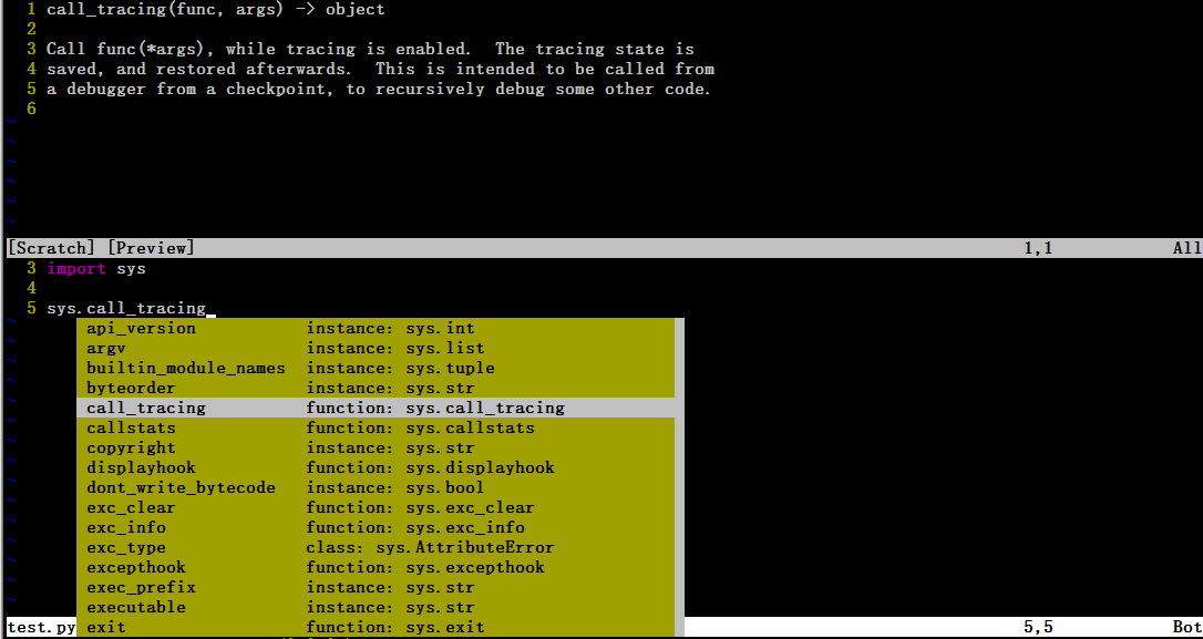 最牛的是,现在在可以弹出自动补全列表的同时,还会在Vim中生成一个预览框,让我看到这个函数的用法!