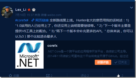 下面就接着@lex_li同学的微博聊下我们的.NET Core 路线图。