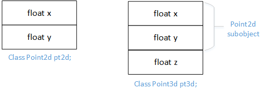 上例中引入了虚函数,C++标准没有规定虚函数指针在内存布局中的位置,这都是由编译器决定。Point2d和Point3d这种单一继承并含有虚函数情况下的内存布局如下: