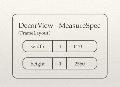 private void performTraversals() { ...... int childWidthMeasureSpec = getRootMeasureSpec(mWidth, lp.width); int childHeightMeasureSpec = getRootMeasureSpec(mHeight, lp.height); ...... mView.measure(childWidthMeasureSpec, childHeightMeasureSpec); ...... mView.layout(0, 0, mView.getMeasuredWidth(), mView.getMeasuredHeight()); ...... mView.draw(canvas); ...... } private static int getRootMeasureSpec(int windowSize, int rootDimension) { int measureSpec; switch (rootDimension) { case ViewGroup.LayoutParams.MATCH_PARENT: // Window can't resize. Force root view to be windowSize. measureSpec = MeasureSpec.makeMeasureSpec(windowSize,MeasureSpec.EXACTLY); break; ...... } return measureSpec; } performTraversals 中我们看到的mView其实就是DecorView,View的绘制从DecorView开始, 在mView.measure()的时候调用getRootMeasureSpec获得两个MeasureSpec做为参数,getRootMeasureSpec的两个参数(mWidth, lp.width)mWith和mHeight 是屏幕的宽度和高度, lp是WindowManager.LayoutParams,它的lp.width和lp.height的默认值是MATCH_PARENT,所以通过getRootMeasureSpec 生成的测量规格MeasureSpec 的mode是MATCH_PARENT ,size是屏幕的高宽。