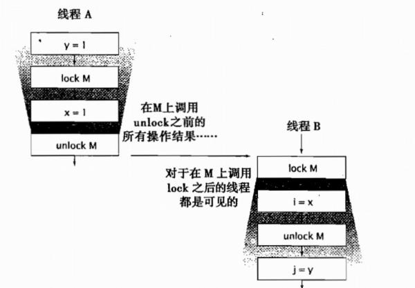 当线程A执行某个同步代码块时,线程B随后进入由同一个锁保护的同步代码块,这种情况下可以保证,当锁被释放前,A看到的所有变量值(锁释放前,A看到的变量包括y和x)在B获得同一个锁后同样可以由B看到。换句话说,当线程B执行由锁保护的同步代码块时,可以看到线程A之前在同一个锁保护的同步代码块中的所有操作结果。如果在线程A unlock M之后,线程B才进入lock M,那么线程B都可以看到线程A unlock M之前的操作,可以得到i=1,j=1。如果在线程B unlock M之后,线程A才进入lock M,那么线程B就不一定能看到线程A中的操作,因此j的值就不一定是1。