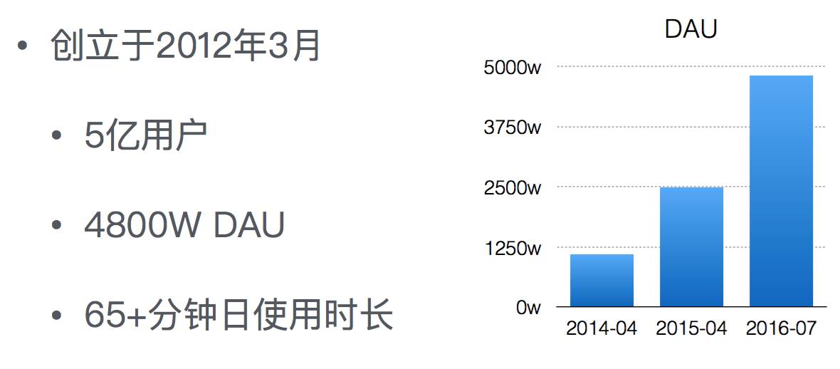 为什么今日头条有这么大的压力?今日头条增长速度是比较快的,从上图可以看出,现在公司已有 4 年,2014 到 2016 年每年都是 DAU 翻番。这对业务挑战是非常大,规模上来以后,我们原有的架构难以做到线性扩展,部分能线性扩展的服务,问题也比较多,业务增长太快,后端压力比较大。