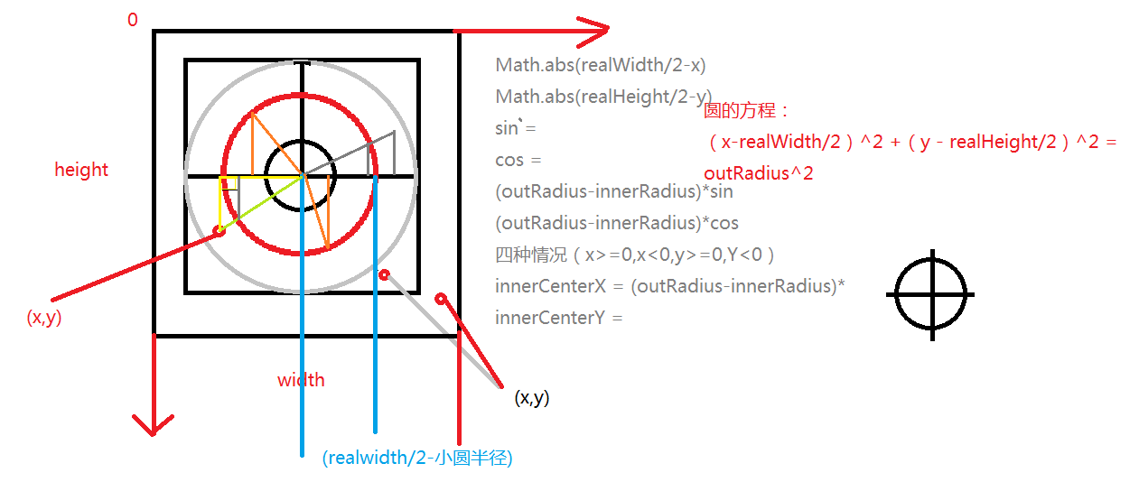 这个方法很长,上面我已经说了,它是用于让内圆根据用户的手指的位置进行位置变动的关键。下面一步一步剖析。附上本人实现过程中绘制的图片。建议在实现一些逻辑时可以绘图帮助记录和启发思维。