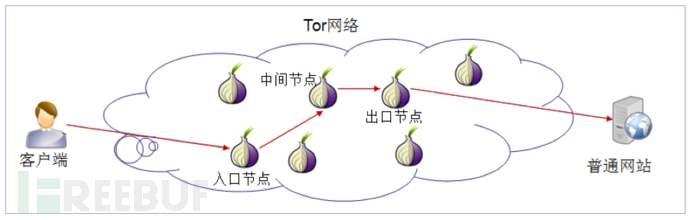 一般情况下,客户端匿名访问普通网站的Tor电路为:首先通过本地代理随机选择一个入口节点,入口节点随机选择一个中间节点,中间节点随机选择一个出口节点,最后出口节点通过TCP 连接并以明文形式携带内容到目的服务器。入口节点知道用户的IP地址,出口节点知道目的服务器的IP地址以及传输内容。但是每一个节点都不知道完整信息流向,从而保证通信的匿名性。