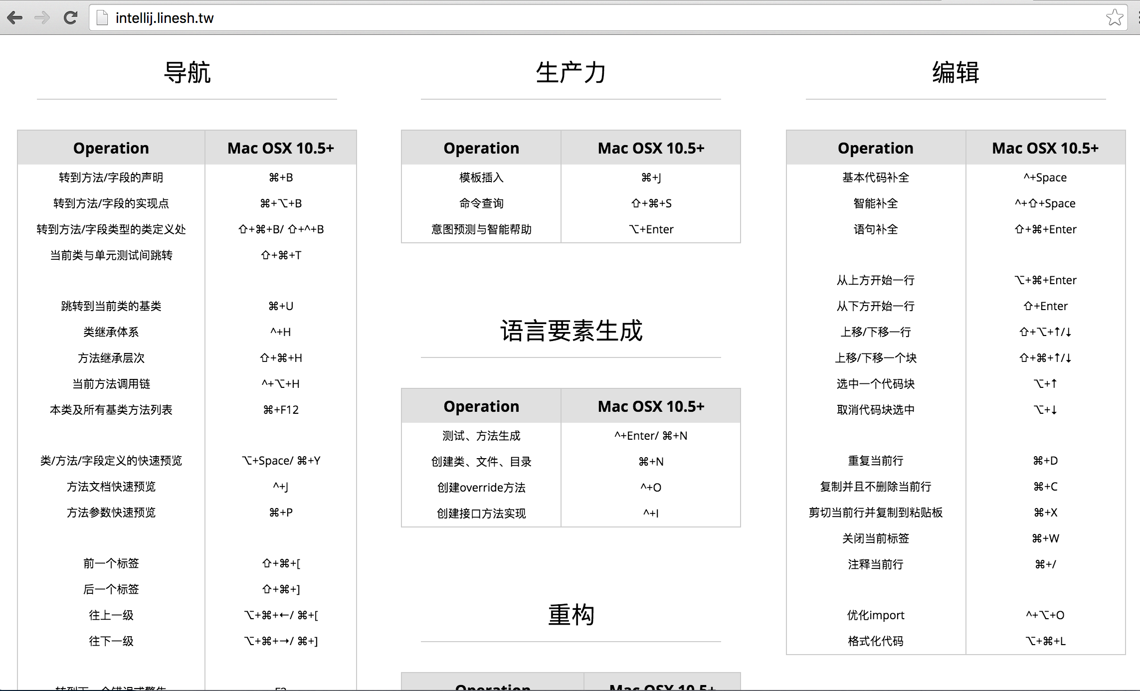 在线精简cheatsheet备查表: intellij.linesh.tw