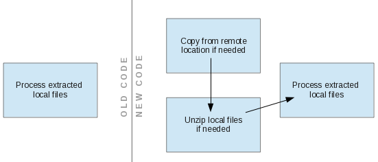 假设传入了一个新需求:应用程序需要处理文件系统上一些以 .zip 文件形式存在的树。处理这种情况的一种直观方式是克隆现有代码来创建处理 .zip 文件的新版本。一种更好的方法是添加拦截器来解决处理 .zip 文件的额外的复杂性。现在,如果额外需要在某些时候从远程位置获取文件,可添加一个额外的抽象层来处理树的位置。这些抽象层如图 1 所示。