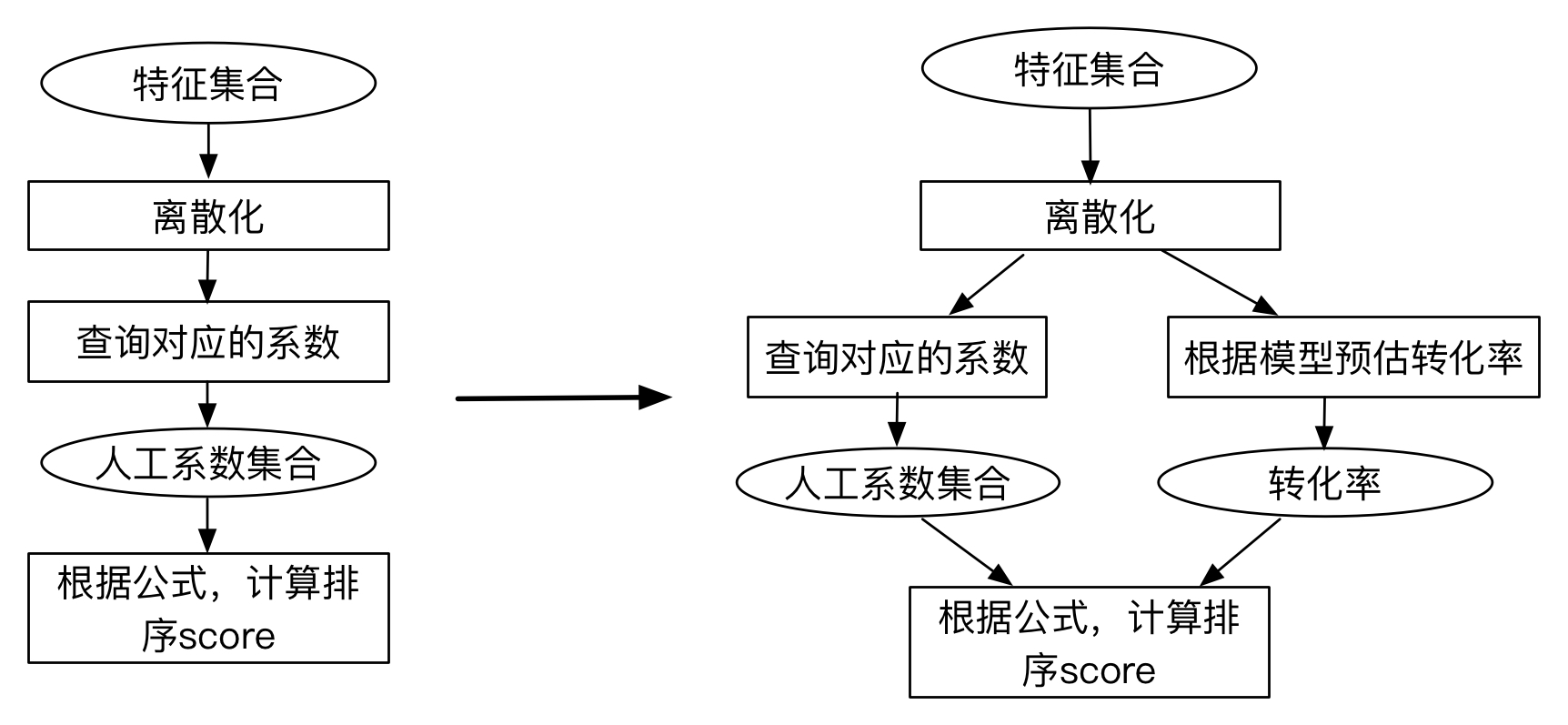后来,随着业务的发展,对规则的维护和升级变得越来越复杂。同时,人工决定的规则无法保证完全合理,也无法捕捉到数据中的隐藏关联。为了解决这一问题,我们引入了转化率预估模型,对商户的转化率进行实时预估,将转化率和人工因子结合在一起,计算出一个组合分值,作为排序的依据。