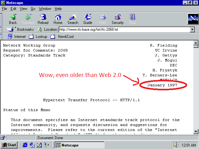 使事情复杂化的是,官方的 HTTP/1.1 指南 —— RFC —— 是写于 1997 年的 。在那一年,人们还在使用 Netscape 浏览器以 33.6 KB 的调制解调器来上网。在现在用 HTTP/1.1 就有点像把孙子兵法运用于现代企业战略,兵法无疑是伟大的,但我根本不知道如何具体运用。