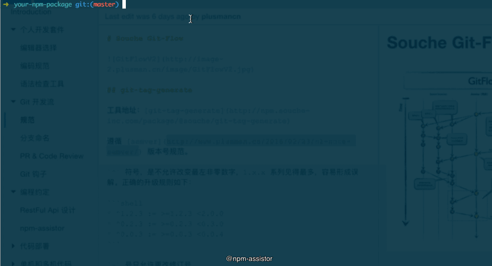 npm 包初始化和 git tag 辅助工具。源于搜车前端内部规范化改造,具体指内部功能模块 SDK 化和 GitFlow 流程规范化。Github: https://github.com/plusmancn/npm-assistor 欢迎 star 和 pr