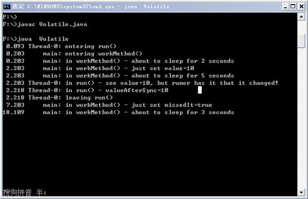 public class Volatile extends Object implements Runnable { //value变量没有被标记为volatile private int value; //missedIt变量被标记为volatile private volatile boolean missedIt; //creationTime不需要声明为volatile,因为代码执行中它没有发生变化 private long creationTime; public Volatile() { value = 10; missedIt = false; //获取当前时间,亦即调用Volatile构造函数时的时间 creationTime = System.currentTimeMillis(); } public void run() { print("entering run()"); //循环检查value的值是否不同 while ( value < 20 ) { //如果missedIt的值被修改为true,则通过break退出循环 if ( missedIt ) { //进入同步代码块前,将value的值赋给currValue int currValue = value; //在一个任意对象上执行同步语句,目的是为了让该线程在进入和离开同步代码块时, //将该线程中的所有变量的私有拷贝与共享内存中的原始值进行比较, //从而发现没有用volatile标记的变量所发生的变化 Object lock = new Object(); synchronized ( lock ) { //不做任何事 } //离开同步代码块后,将此时value的值赋给valueAfterSync int valueAfterSync = value; print("in run() - see value=" + currValue +", but rumor has it that it changed!"); print("in run() - valueAfterSync=" + valueAfterSync); break; } } print("leaving run()"); } public void workMethod() throws InterruptedException { print("entering workMethod()"); print("in workMethod() - about to sleep for 2 seconds"); Thread.sleep(2000); //仅在此改变value的值 missedIt = true; // value = 50; print("in workMethod() - just set value=" + value); print("in workMethod() - about to sleep for 5 seconds"); Thread.sleep(5000); //仅在此改变missedIt的值 // missedIt = true; value = 50; print("in workMethod() - just set missedIt=" + missedIt); print("in workMethod() - about to sleep for 3 seconds"); Thread.sleep(3000); print("leaving workMethod()"); } /* *该方法的功能是在要打印的msg信息前打印出程序执行到此所化去的时间,以及打印msg的代码所在的线程 */ private void print(String msg) { //使用java.text包的功能,可以简化这个方法,但是这里没有利用这一点 long interval = System.currentTimeMillis() - creationTime; String tmpStr = " " + ( interval / 1000.0 ) + "000"; int pos = tmpStr.indexOf("."); String secStr = tmpStr.substring(pos - 2, pos + 4); String nameStr = " " + Thread.currentThread().getName(); nameStr = nameStr.substring(nameStr.length() - 8, nameStr.length()); System.out.println(secStr + " " + nameStr + ": " + msg); } public static void main(String[] args) { try { //通过该构造函数可以获取实时时钟的当前时间 Volatile vol = new Volatile(); //稍停100ms,以让实时时钟稍稍超前获取时间,使print()中创建的消息打印的时间值大于0 Thread.sleep(100); Thread t = new Thread(vol); t.start(); //休眠100ms,让刚刚启动的线程有时间运行 Thread.sleep(100); //workMethod方法在main线程中运行 vol.workMethod(); } catch ( InterruptedException x ) { System.err.println("one of the sleeps was interrupted"); } } } 执行结果如下: