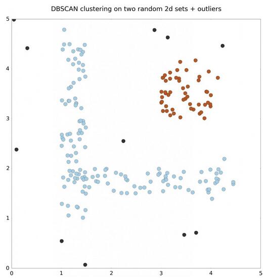 这个算法可以通过两个参数进行调试: ε,用来确定离给定的点多远来搜索;和minPoints,即为了类簇扩展,决定一个给定的点的邻域附近最少有多少点。通过寻找邻近点,本地类簇开始出现,各种形状的类簇逐渐可以被识别(请参见图1的简化描述)。过于孤立的点和离其他点太远的点则会被分配到一个特殊的异常值集群。这些独特的属性使DBSCAN算法适合对地理定位事件进行聚类。