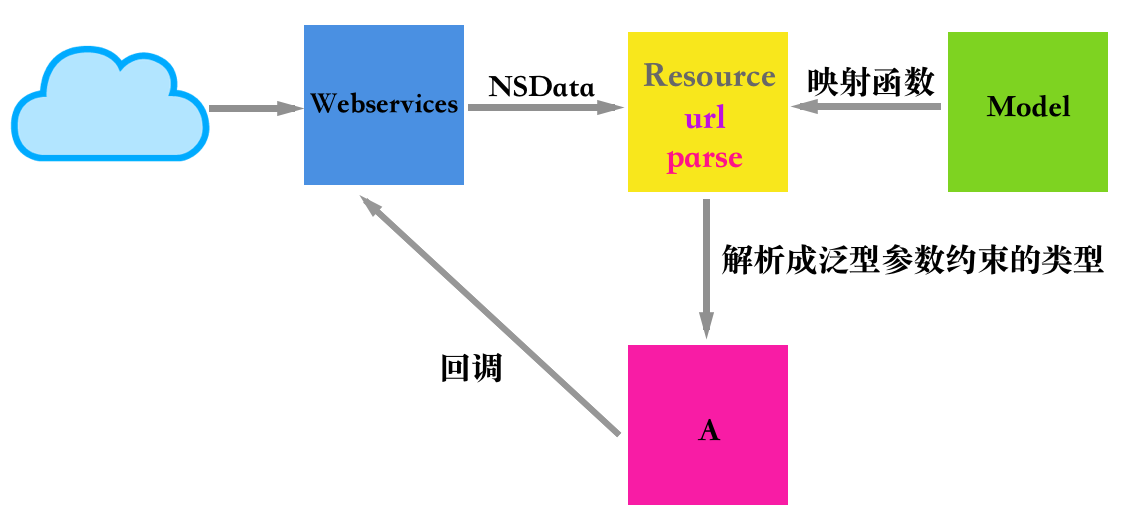 Webservice 专门负责网络请求,它需要 Resource<A> 提供一些必要的网络请求的参数,并且将网络请求得到的数据(NSData)传递给 Resource<A> 的解析函数