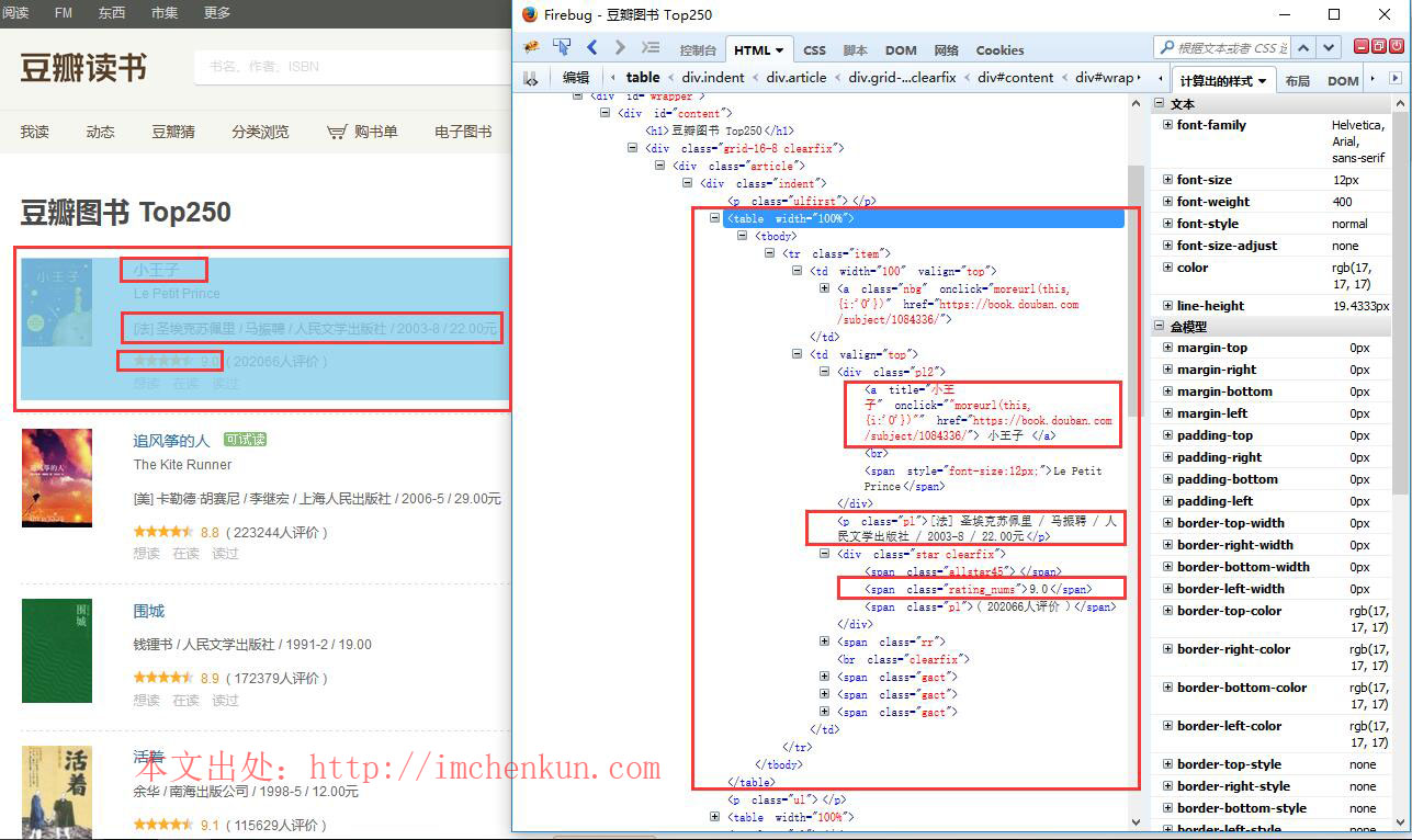 目标一是豆瓣的TOP250图书信息,首先我们进入到TOP250的列表(https://book.douban.com/top250) ,我用图示圈出我们这次要爬取的内容,具体请看图示: