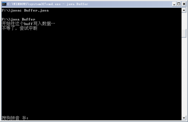 public class Buffer { private Object lock; public Buffer() { lock = this; } public void write() { synchronized (lock) { long startTime = System.currentTimeMillis(); System.out.println("开始往这个buff写入数据…"); for (;;)// 模拟要处理很长时间 { if (System.currentTimeMillis() - startTime > Integer.MAX_VALUE) { break; } } System.out.println("终于写完了"); } } public void read() { synchronized (lock) { System.out.println("从这个buff读数据"); } } public static void main(String[] args) { Buffer buff = new Buffer(); final Writer writer = new Writer(buff); final Reader reader = new Reader(buff); writer.start(); reader.start(); new Thread(new Runnable() { @Override public void run() { long start = System.currentTimeMillis(); for (;;) { //等5秒钟去中断读 if (System.currentTimeMillis() - start > 5000) { System.out.println("不等了,尝试中断"); reader.interrupt(); //尝试中断读线程 break; } } } }).start(); // 我们期待“读”这个线程能退出等待锁,可是事与愿违,一旦读这个线程发现自己得不到锁, // 就一直开始等待了,就算它等死,也得不到锁,因为写线程要21亿秒才能完成 T_T ,即使我们中断它, // 它都不来响应下,看来真的要等死了。这个时候,ReentrantLock给了一种机制让我们来响应中断, // 让“读”能伸能屈,勇敢放弃对这个锁的等待。我们来改写Buffer这个类,就叫BufferInterruptibly吧,可中断缓存。 } } class Writer extends Thread { private Buffer buff; public Writer(Buffer buff) { this.buff = buff; } @Override public void run() { buff.write(); } } class Reader extends Thread { private Buffer buff; public Reader(Buffer buff) { this.buff = buff; } @Override public void run() { buff.read();//这里估计会一直阻塞 System.out.println("读结束"); } } 执行结果如下: