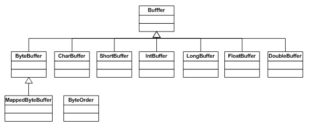 每一个Buffer类都是Buffer接口的一个实例。 除了ByteBuffer, 每一个Buffer类都有完全一样的操作,只是它们所处理的数据类型不一样。因为大多数标准I/O操作都使用ByteBuffer,所以它具有所有共享的 缓冲区操作以及一些特有的操作。我们来看一下Buffer的类层次图吧: