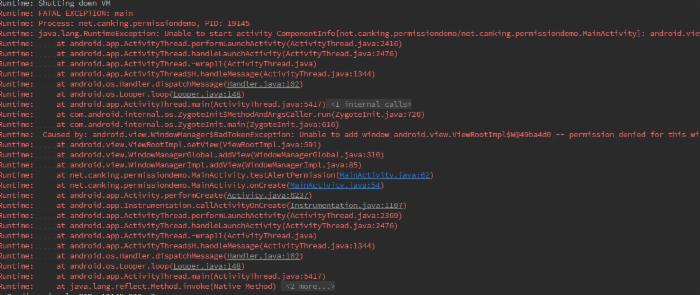 private void testAlertPermission() { WindowManager mWindowManager = (WindowManager) getSystemService( Context.WINDOW_SERVICE); WindowManager.LayoutParams params = new WindowManager.LayoutParams(); params.type = WindowManager.LayoutParams.TYPE_SYSTEM_ALERT; mWindowManager.addView(new TextView(this), params); } // Here, thisActivity is the current activity if (ContextCompat.checkSelfPermission(thisActivity, Manifest.permission.READ_CONTACTS) != PackageManager.PERMISSION_GRANTED) { // Should we show an explanation? if (ActivityCompat.shouldShowRequestPermissionRationale(thisActivity, Manifest.permission.READ_CONTACTS)) { // Show an expanation to the user *asynchronously* -- don't block // this thread waiting for the user's response! After the user // sees the explanation, try again to request the permission. } else { // No explanation needed, we can request the permission. ActivityCompat.requestPermissions(thisActivity, new String[]{Manifest.permission.READ_CONTACTS}, MY_PERMISSIONS_REQUEST_READ_CONTACTS); // MY_PERMISSIONS_REQUEST_READ_CONTACTS is an // app-defined int constant. The callback method gets the // result of the request. } } requestPermissions方法调用时会弹出以下对话框.当用户点击拒绝并且勾选了不再弹出后这个对话框将不会再弹出,会直接拒绝掉该权限: