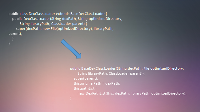 DexClassLoader的构造方法里面调用了父类的构造方法,我们跟进去可以看到BaseDexClassLoader 里面有个dexPath参数,这个通常是应用储存apk的目录/data/../*.apk。现在用来作为创建pathList。我们再看看new DexPathList里面做了什么。