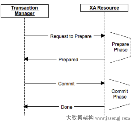 XA是由X/Open组织提出的分布式事务的规范。XA规范主要定义了(全局)事务管理器(Transaction Manager)和(局部)资源管理器(Resource Manager)之间的接口。XA接口是双向的系统接口,在事务管理器(Transaction Manager)以及一个或多个资源管理器(Resource Manager)之间形成通信桥梁。XA引入的事务管理器充当上文所述全局事务中的“协调者”角色。事务管理器控制着全局事务,管理事务生命周期,并协调资源。资源管理器负责控制和管理实际资源(如数据库或JMS队列)。目前,Oracle、Informix、DB2、Sybase和PostgreSQL等各主流数据库都提供了对XA的支持。
