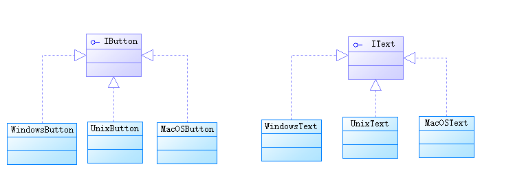 抽象工厂模式的起源或者最早的应用,是对不同操作系统的图形化解决方案,比如在不同操作系统中的按钮和文字框的不同处理,展示效果也不一样,对于每一个操作系统,其本身构成一个工厂类,而按钮与文字框控件构成一个产品类,两种产品类两种变化,各自有自己的特性,比如 Windows,Unix 和 Mac OS 下的 Button 和 Text 等。所以据此,我们可以初步构建框架: