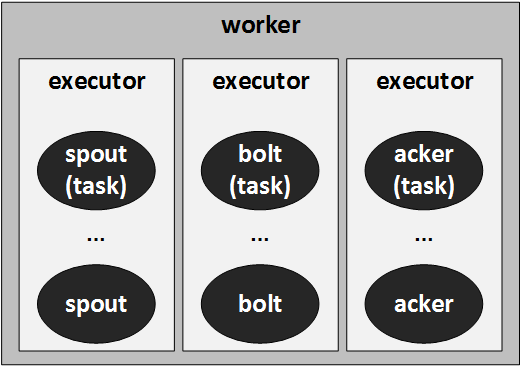 executor线程负责处理多个spouts或者多个bolts的逻辑,这些spouts或者bolts,也称为tasks。