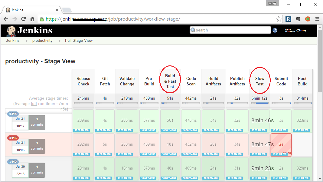 如图,每一横条代表一次代码提交的完整过程。核心步骤是Build & Fast Test及Slow-Test。前者负责构件及单元测试(通常是mvn install, gradle build, gulp build),后者负责搭建一个“半完整”环境执行“集成测试”。任何一步失败会导致当前这次提交被拒绝。我们为60多个git repo分别搭建了对应的CD pipeline,上图是其中一个微服务,名字叫productivity。