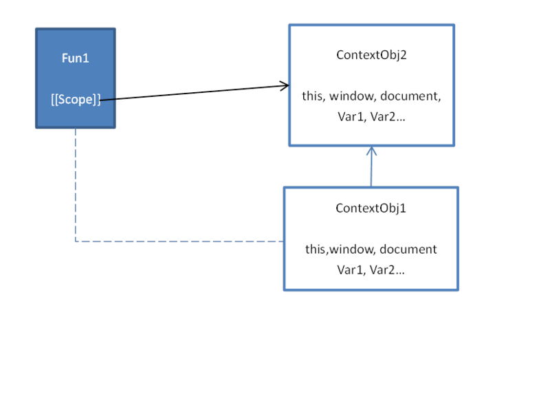 该函数执行的时候,使用函数内的函数作用域变量创建一个新执行环境对象,并且引用 scope 属性指向的执行环境对象。这个执行环境对象和该函数的执行上下文相对应。