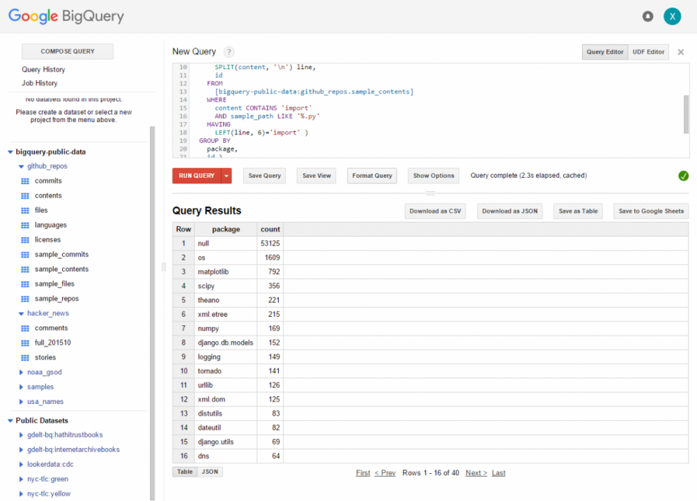 整体的语法都和SQL非常接近,鉴于点进来的人很多都是冲着“有趣”这两个字来的,就不过多介绍代码了。这段代码的作用是找到github仓库中,使用Python语言的仓库中,前10个被引用的库。