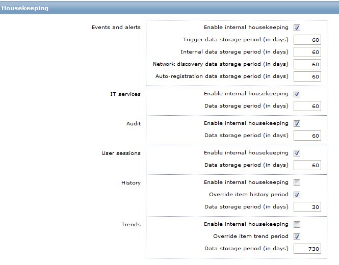 UPDATE config SET hk_events_trigger=60,hk_events_internal=60, hk_events_discovery=60,hk_events_autoreg=60,hk_audit=60,hk_sessions=60, hk_history=30,hk_history_mode=0, hk_history_global=1,hk_trends_mode=0, hk_trends_global=1,hk_trends=730,hk_services=60;