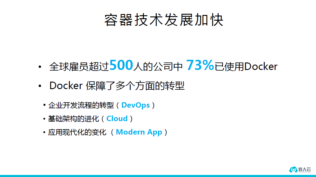 最新的资料显示,现在是应用Docker技术的比较好的时机。全球雇员超过500人的公司中73%已使用Docker技术。国内的很多公司也都在关注这项技术,尤其是金融行业,因为金融业的IT发展的比较成熟,他们对新技术比较关注,Docker已经有很多生产应用在里面产生。