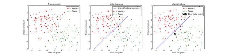 机器学习的基准原则相当简单,设想下我们想要建立一种能够分辨苹果和梨的机器。数字图像是由一个物体、两个称为特征的值组成的,其中这些值是通过一小段手工代码从数字图像中提取的。这些代码能提取图像中对象的颜色(从红色到绿色)以及对象的形状(从圆形到椭圆形)。现在想象一下,我们有一组包含苹果和梨的图像。对于每一个图像,如果它包含一个苹果或一个梨,我们会直接用这些图像的标签来称呼它。当我们计算训练集中图像的特性并将它们绘制出来的话,得到的结果如下图所示。