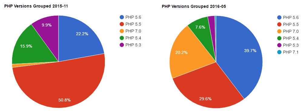 All versions Grouped PHP 5.5.9 11.87% PHP 5.6 39.67% PHP 7.0.6 10.39% PHP 5.5 29.56% PHP 5.6.20 8.41% PHP 7.0 20.24% PHP 5.6.21 7.69% PHP 5.4 7.64% PHP 5.6.19 4.71% PHP 5.3 2.43%