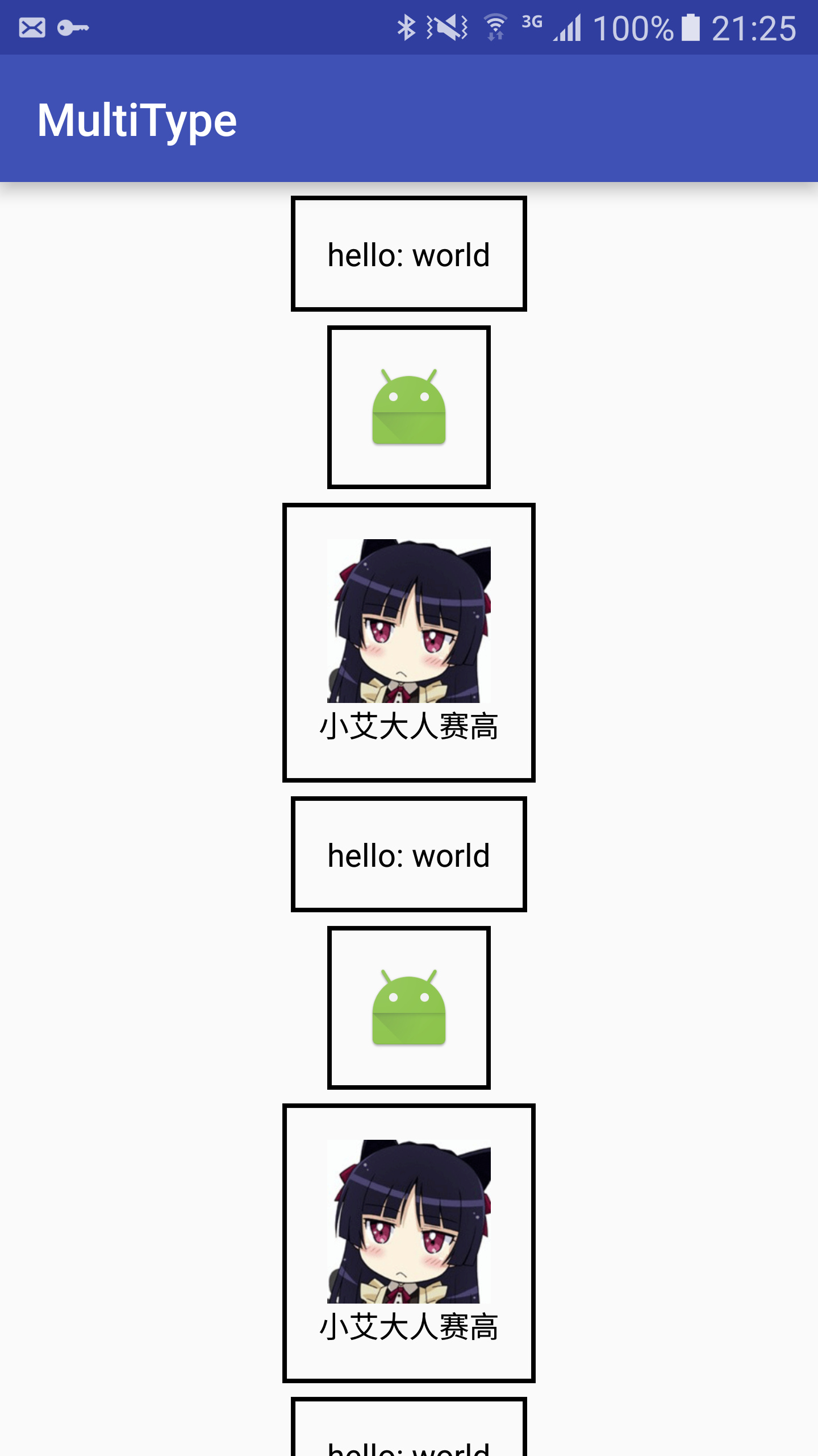 Activity 中加入 RecyclerView 和 List<TypeItem> 即可,示例: @Override protected void onCreate(Bundle savedInstanceState) { super.onCreate(savedInstanceState); setContentView(R.layout.activity_main); recyclerView = (RecyclerView) findViewById(R.id.list); itemFactory = new TypeItemFactory.Builder().build(); TypeItem textItem = itemFactory.newItem(new TextItemContent("world")); TypeItem imageItem = itemFactory.newItem(new ImageItemContent(R.mipmap.ic_launcher)); TypeItem richItem = itemFactory.newItem(new RichItemContent("小艾大人赛高", R.mipmap.avatar)); List<TypeItem> typeItems = new ArrayList<>(80); for (int i = 0; i < 20; i++) { typeItems.add(textItem); typeItems.add(imageItem); typeItems.add(richItem); } /* register the types before setAdapter, that's all right */ ItemTypePool.register(TextItemContent.class, new TextItemViewProvider()); ItemTypePool.register(ImageItemContent.class, new ImageItemViewProvider()); ItemTypePool.register(RichItemContent.class, new RichItemViewProvider()); recyclerView.setAdapter(new TypeItemsAdapter(typeItems)); }