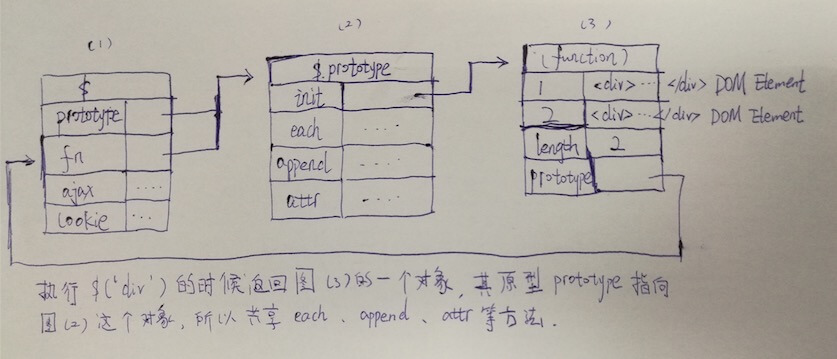 我们需要一个包装着DOM Elements的伪数组,此伪数组对象使用原型链去挂载共享的DOM处理方法,原理如下图。