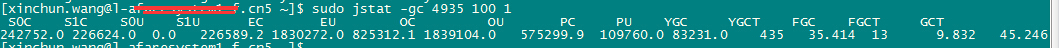 -gc JVM中堆的垃圾收集情况的统计 列名 说明 S0C 新生代中Survivor space中S0当前容量的大小(KB) S1C 新生代中Survivor space中S1当前容量的大小(KB) S0U 新生代中Survivor space中S0容量使用的大小(KB) S1U 新生代中Survivor space中S1容量使用的大小(KB) EC Eden space当前容量的大小(KB) EU Eden space容量使用的大小(KB) OC Old space当前容量的大小(KB) OU Old space使用容量的大小(KB) PC Permanent space当前容量的大小(KB) PU Permanent space使用容量的大小(KB) YGC 从应用程序启动到采样时发生 Young GC 的次数 YGCT 从应用程序启动到采样时 Young GC 所用的时间(秒) FGC 从应用程序启动到采样时发生 Full GC 的次数 FGCT 从应用程序启动到采样时 Full GC 所用的时间(秒) GCT T从应用程序启动到采样时用于垃圾回收的总时间(单位秒),它的值等于YGC+FGC