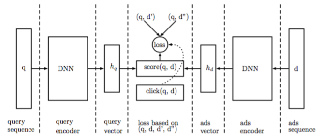 对于一个(query,ad)数据对,分别用LSTM encode,然后用下图的方法计算一个attention,得到最终的query和ad vector,构造loss function,取logs中(query,ad)作为正例d+,将ad替换为其他无关ad作为负例d-,训练的目标是让d+的score尽量大,让d-的score尽量小。