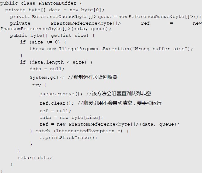 在上面的代码中,每次申请新的缓存的时候,都要确保之前的字节数组被成功回收。引用队列的remove方法会阻塞直到虚引用被加入到引用队列中。【只有对象在内存中被移除之后才会进入引用队列中】【?这里有点不太确定。后续补发】