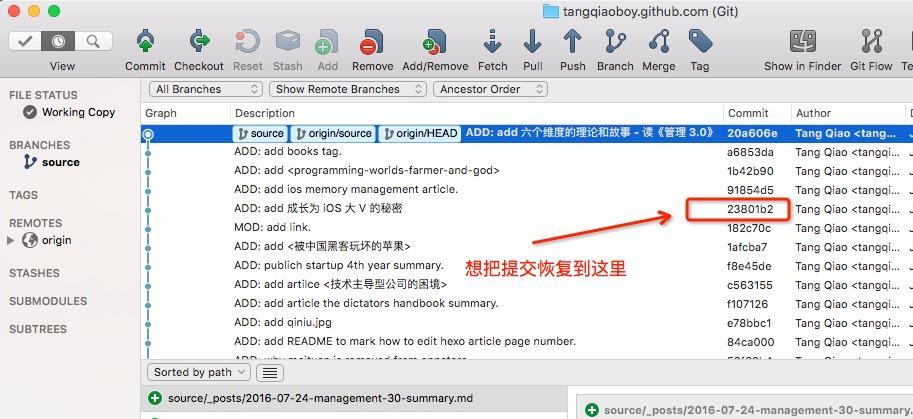 执行完上面两步后,你的仓库还是最新的提交,但是工作区变成了历史的提交内容,这个时候用 git add 和 git commit 即可。最终完成的效果如下: